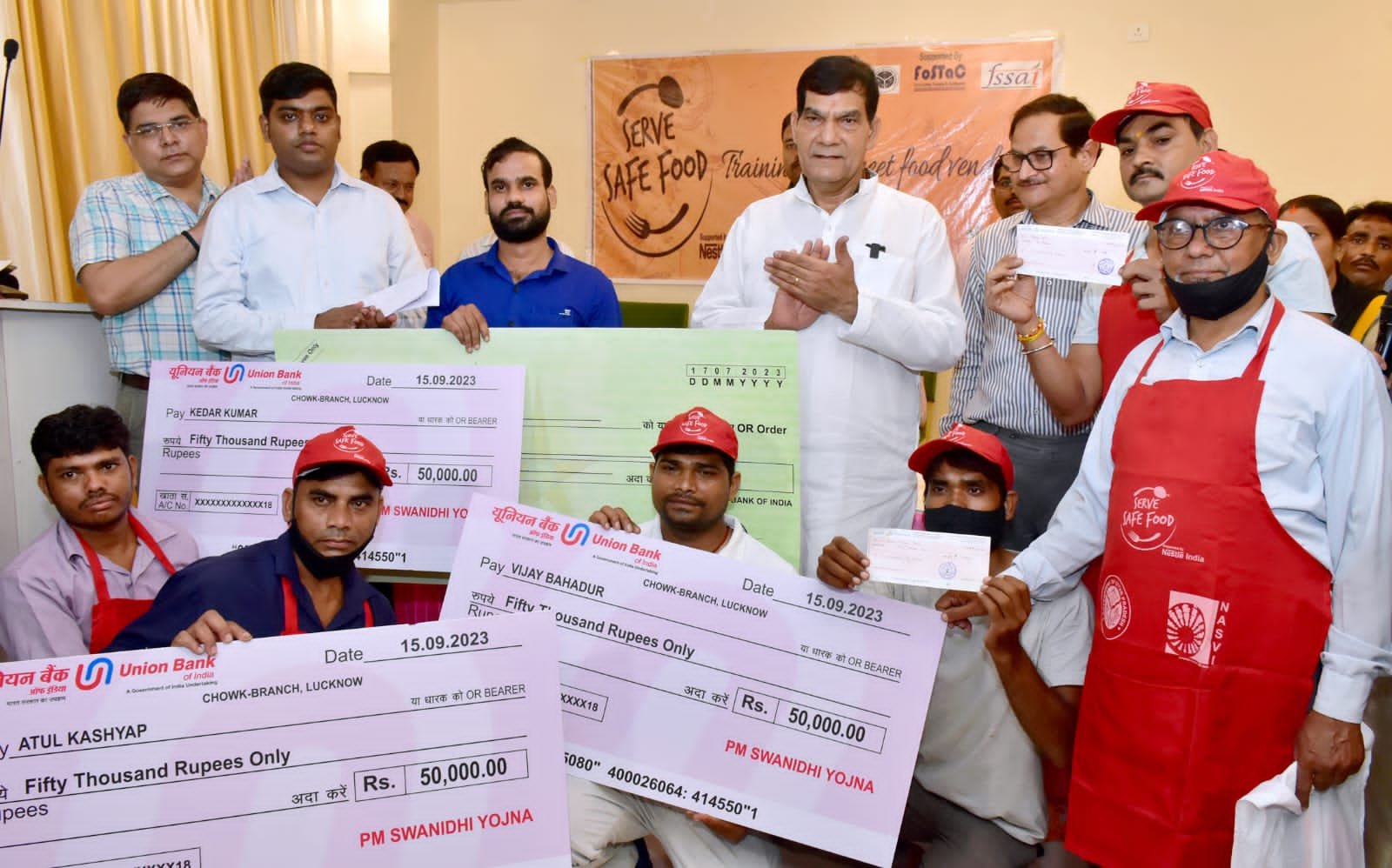 नगर विकास मंत्री ए0के0 शर्मा शुक्रवार को नेशनल एसोसिएशन आफ स्ट्रीट वेन्डर्स आफ इण्डिया द्वारा फूड सेफ्टी व हाइजिन को लेकर स्ट्रीट वेन्डर्स के लिए टेकरीज इन, लखनऊ में आयोजित प्रशिक्षण कार्यक्रम को सम्बोधित कर रहे थे। उन्होंने कहा कि उत्तरप्रदेश में स्ट्रीट वेन्डर्स के लिए 01 जून, 2020 को पीएम स्वनिधि योजना प्रारम्भ की गयी। इसके तहत प्रथम ऋण में 10,000 रुपए द्वितीय ऋण में 20,000 रुपए तथा तृतीय ऋण में 50,000 रुपए ब्याज अनुदान आधारित ऋण बैंकों द्वारा उपलब्ध कराया जा रहा। साथ ही वेन्डर्स द्वारा डिजिटल लेनदेन करने से कैशबैक के रूप में प्रतिमाह अधिकतम 100 रुपए भी प्राप्त हो रहे।