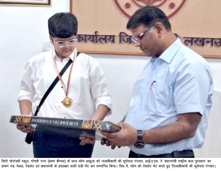 लखनऊ। सिटी मोन्टेसरी स्कूल, गोमती नगर (प्रथम कैम्पस) के कक्षा-10 के बहुमुखी प्रतिभा के धनी छात्र व्योम आहूजा को कला और संस्कृति के क्षेत्र में असाधारण उपलब्धियों के लिए प्रधानमंत्री राष्ट्रीय बाल पुरस्कार प्रदान कर सम्मानित किया गया। जिलाधिकारी कार्यालय में आयोजित एक विशेष समारोह में जिलाधिकारी सूर्यपाल गंगवार, आईएएस ने व्योम को प्रधानमंत्री राष्ट्रीय बाल पुरस्कार-2021 का प्रमाण पत्र, मेडल, टेबलेट एवं प्रधानमंत्री के हस्ताक्षर वाली घड़ी भेंट कर सम्मानित किया।
