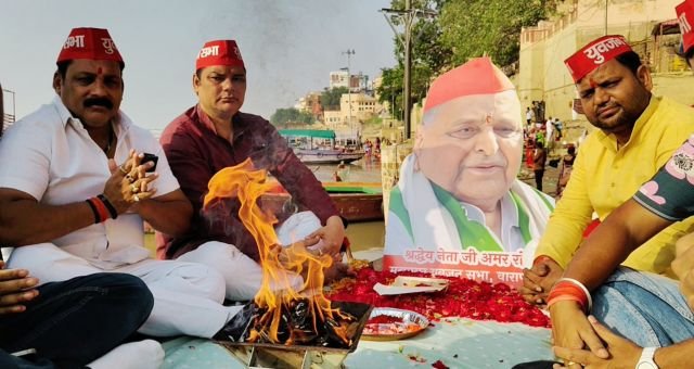 काशी के गायघाट पर समाजवादी पार्टी (सपा) के संस्थापक और उत्तर प्रदेश के पूर्व मुख्यमंत्री स्वर्गीय मुलायम सिंह यादव (Mulayam Singh Yadav) की तीसरी पुण्यतिथि पर शुक्रवार को एक भव्य अनुष्ठान का आयोजन किया गया। समाजवादी पार्टी युवजन सभा के बैनर तले आयोजित इस कार्यक्रम में सपा कार्यकर्ताओं ने अपने प्रिय नेता को भावपूर्ण श्रद्धांजलि अर्पित की और उनकी आत्मा की शांति व तृप्ति के लिए वैदिक मंत्रों के साथ हवन-पूजन संपन्न कराया।