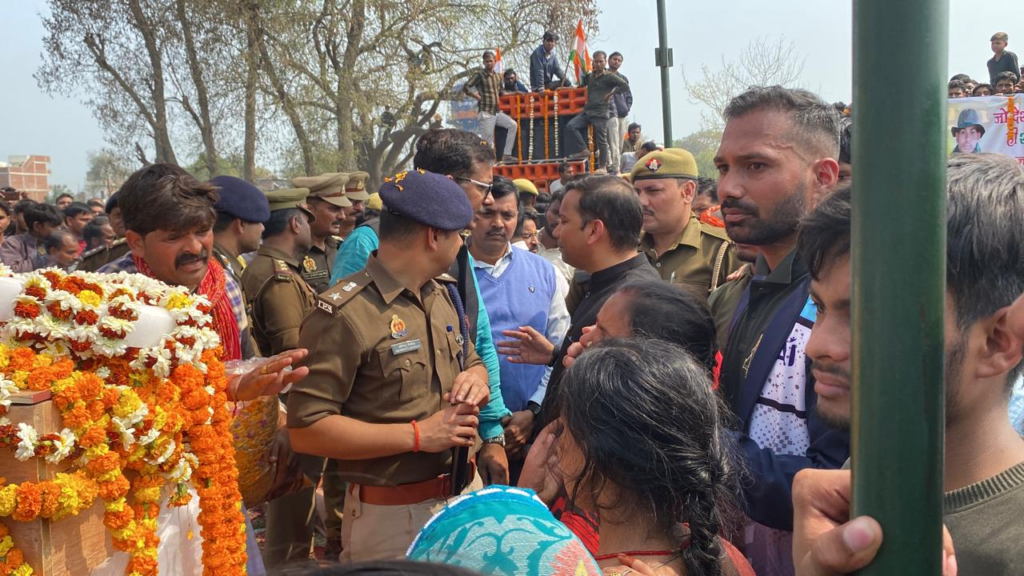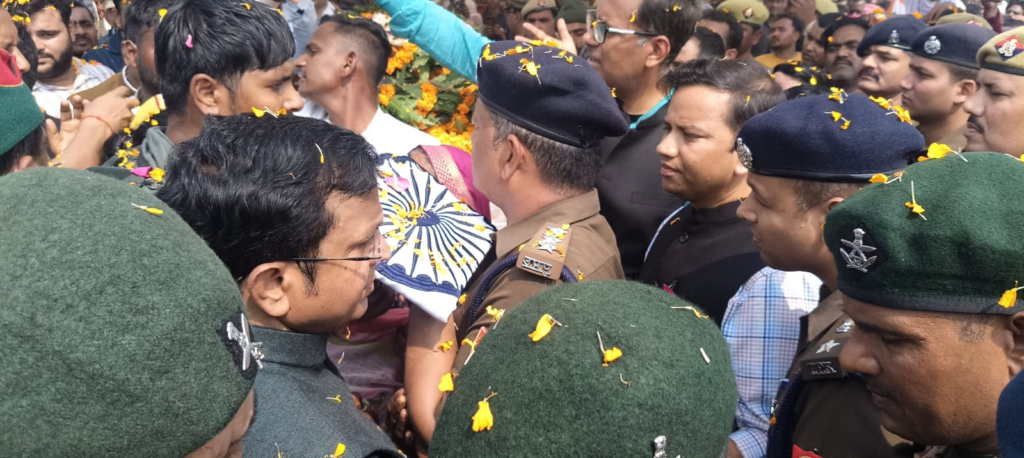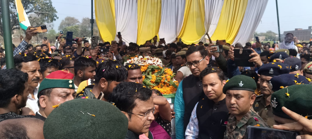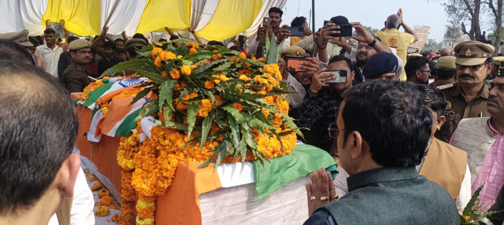 शहीद धीरज कुमार गुप्ता का पार्थिव शरीर शनिवार को जब उनके पैतृक गांव जेठुपुर (Bhadohi) पहुंचा तो हजारों की संख्या में लोग अंतिम दर्शन के लिए उमड़ पड़े। जनप्रतिनिधियों, प्रशासनिक अधिकारियों और आम नागरिकों ने पुष्पचक्र अर्पित कर उन्हें श्रद्धांजलि दी। सांसद, जिलाधिकारी और पुलिस अधीक्षक सहित कई अधिकारी मौके पर मौजूद रहे।