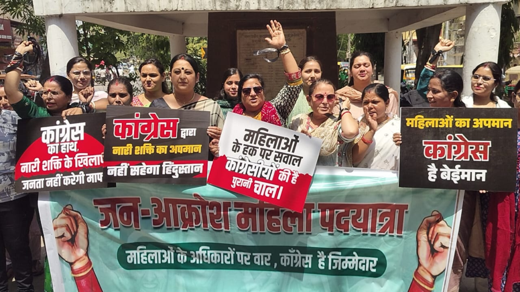 वाराणसी शहर में बुधवार को BJP महिला मोर्चा की ओर से “जन आक्रोश महिला पदयात्रा” निकाली गई। नारी शक्ति वंदन अधिनियम से जुड़े संशोधन विधेयक के लोकसभा में पारित न होने के विरोध में यह प्रदर्शन किया गया। इस दौरान महिला कार्यकर्ताओं ने विपक्षी दलों को जिम्मेदार ठहराते हुए जोरदार नारेबाजी की।