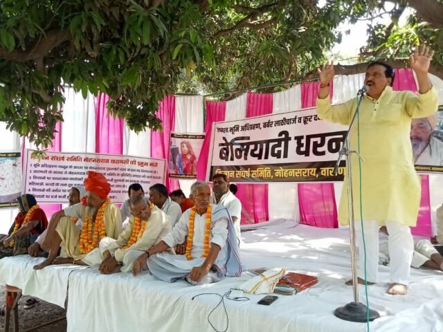 वाराणसी। मोहनसराय किसान संघर्ष समिति के तत्वावधान में सोमवार को बैरवन में अनिश्चित कालीन बेमियादी धरना अनवरत चौथे दिन जारी रहा। उच्च न्यायालय इलाहाबाद का स्पष्ट आदेश है कि मुआवजा नहीं लेने वाले किसानों का मालिकाना हक बना रहेगा, उसके बावजूद करनाडाड़ी के किसान मेवालाल, शारदा, बाबूलाल आदि के आराजी नंबर 235 की जमीन पर जिला प्रशासन द्वारा कार्यवाई से आक्रोशित 11 किसानों को माल्यार्पण कर समिति के मुख्य संरक्षक विनय शंकर राय ‘मुन्ना’ ने क्रमिक अनशन पर बैठाया।