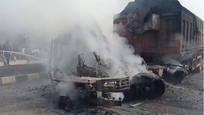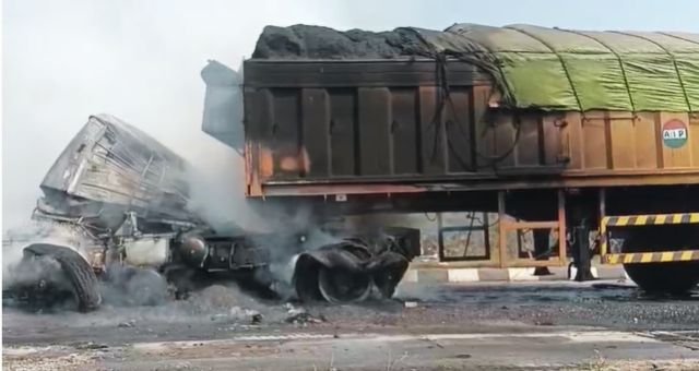 बताते चलें कि टक्कर लगते ही कोयदा लदे ट्रेलर में भीषण आग लग गई। आग लगने से ट्रेलर धू-धू करके जलने लगा, इस दौरान संदीप राना वाहन के अंदर ही फंस गया और उसकी मौके पर जिंदा जलकर मौत हो गई। वहीं टक्कर मारने के बाद दूसरा ट्रेलर चालक वाहन समेत फरार हो गया। पुलिस ने शव को कब्जे में लेकर आगे की कार्रवाई शुरू कर दी है। वहीं फरार ट्रेलर चालक की तलाश की जा रही है।