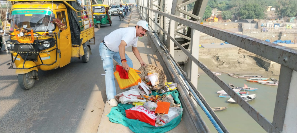 Namami Gange: दीपावली के पूर्व बुधवार को नमामि गंगे अभियान के तहत काशी क्षेत्र के संयोजक और नगर निगम स्वच्छता ब्रांड एंबेसडर राजेश शुक्ला ने राजघाट पुल पर लोगों को गंगा में पूजन सामग्री और निर्माल्य फेंकने से रोकने का कार्य किया। उन्होंने पुल पर से सामग्री फेंकने की कोशिश कर रहे सैकड़ों राहगीरों से सामग्रियां एकत्रित कर कूड़ेदान तक पहुंचाईं।