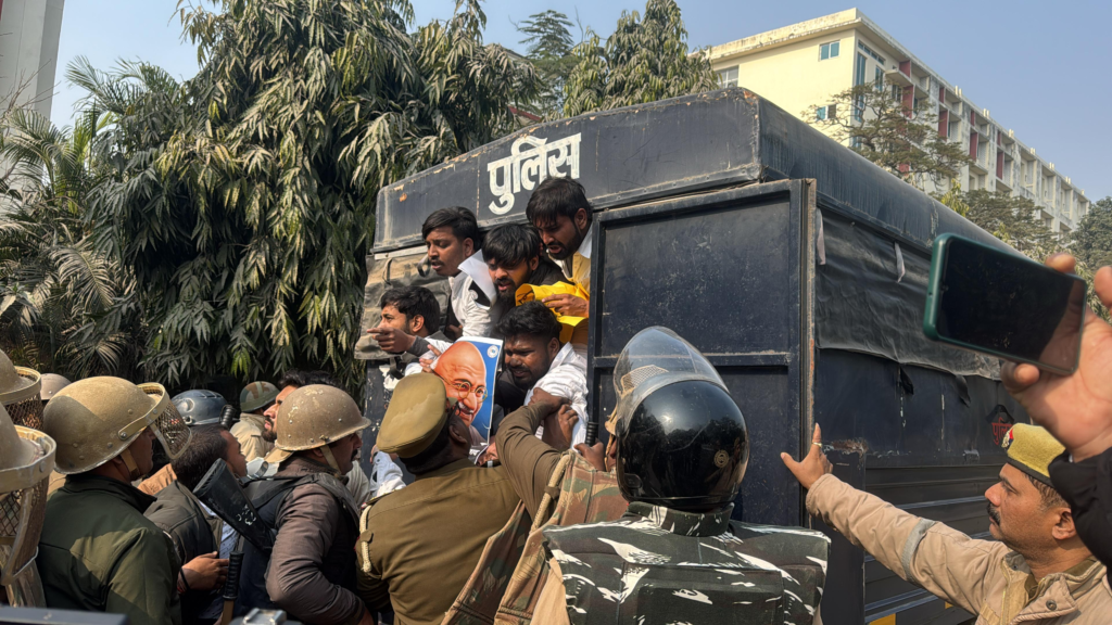 वाराणसी में जी राम जी बिल (मनरेगा संसोधन अधिनियम) के विरोध को लेकर NSUI कार्यकर्ताओं ने रविवार को बड़ा शक्ति प्रदर्शन किया। प्रदेश के अलग–अलग हिस्सों से NSUI कार्यकर्ता काशी पहुंचे और अपनी आवाज बुलंद की। वहीं अब तक सैकड़ों कार्यकर्ताओं को पुलिस ने हिरासत में ले लिया है।