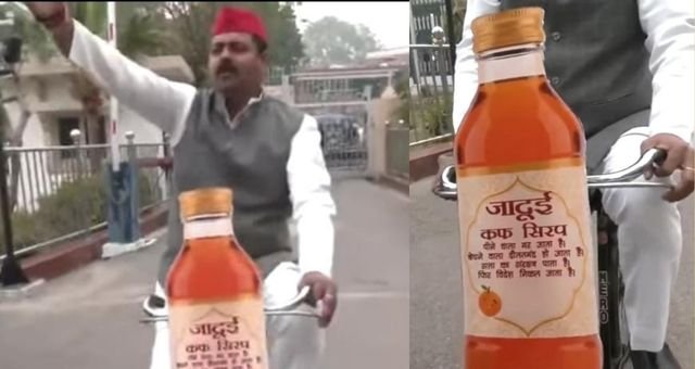UP: कफ सिरप की शीशी का कट आउट लेकर पहुंचे सदन