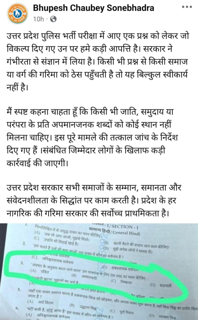 सोनभद्र जनपद के राबर्ट्सगंज विधानसभा सीट से भाजपा विधायक भूपेश चौबे ने कड़ी आपत्ति जताई है। उन्होंने अपने फेसबुक एकाउन्ट पेज पर लिखा कि उत्तर प्रदेश पुलिस भर्ती परीक्षा (UP SI exam) में आए एक प्रश्न को लेकर जो विकल्प दिए गए उन पर हमें कड़ी आपत्ति है। सरकार ने गंभीरता से संज्ञान में लिया है। किसी भी प्रश्न से किसी समाज या वर्ग की गरिमा को ठेस पहुँचती है तो यह बिल्कुल स्वीकार्य नहीं है।