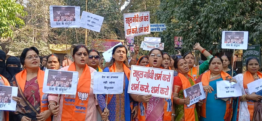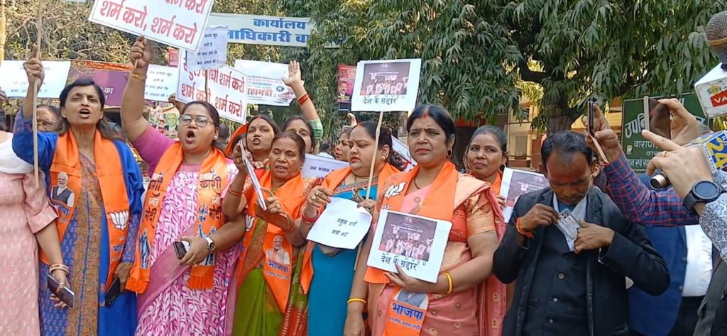 Varanasi: विगत दिनों AI समिट के दौरान कांग्रेसियों द्वारा अर्धनग्न होकर प्रदर्शन किया गया। उसे लेकर पुरे देश में आक्रोश है। लगातार इसका विरोध किया जा रहा है। इसी कड़ी में वाराणसी में आज बीजेपी महिला मोर्चा का भी प्रदर्शन देखने को मिला। जब बड़ी संख्या में महिला मोर्चा की पदाधिकारी व कार्यकर्ता जिला मुख्यालय पर एकत्रित हुई। उन्होंने राहुल गाँधी होश में आओ, राहुल गाँधी शर्म करो जैसे जमकर नारे लगाये।