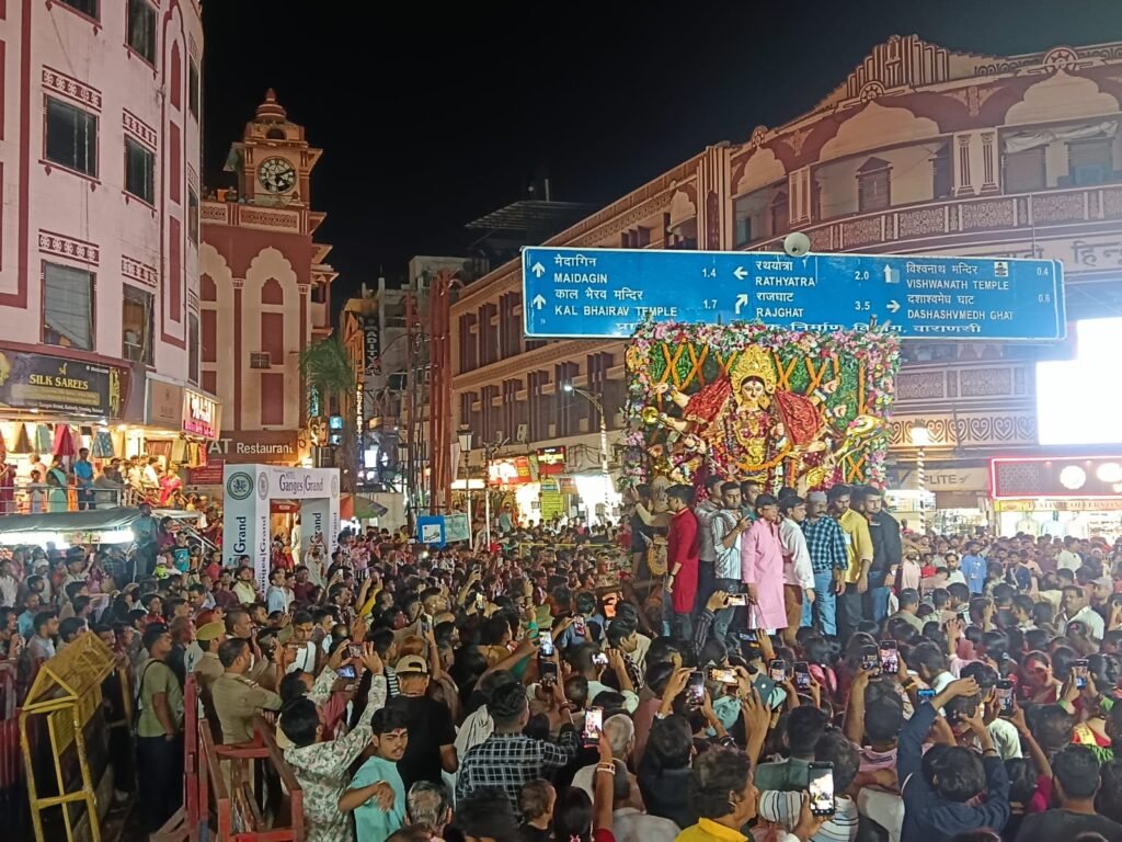 प्रतिमा के आगे-आगे श्रद्धालु नाचते-गाते चल रहे थे। ढाक और डीजे की धुन पर लोग झूम उठे। जगह-जगह भक्तों ने आरती उतारी और पुष्पवर्षा कर मां का स्वागत किया। करीब सात बजे प्रतिमा मदनपुरा (Varanasi) की मुख्य सड़क पर पहुंची और वहां से गोदौलिया चौराहे की ओर बढ़ी। रास्ते भर “जय माता दी” के नारे गूंजते रहे।