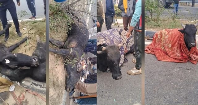 Varanasi chaubepur: क्षेत्र के बभनपुरा रिंग रोड स्थित गंगा पुल के पास मंगलवार देर रात पशु तस्करी का एक गंभीर मामला सामने आया। मेटाडोर और पिकअप वाहन की आमने–सामने हुई जोरदार टक्कर में दो गायों की मौके पर ही मौत हो गई, जबकि तीन अन्य गायें गंभीर रूप से घायल हो गईं। घायलों के पैर टूटने की सूचना है।प्रत्यक्षदर्शियों के अनुसार, पिकअप वाहन में पांच गायों को बेहद क्रूरता के साथ ठूंस–ठूंसकर भरा गया था। तेज रफ्तार और लापरवाही के कारण पिकअप वाहन सामने से आ रहे मेटाडोर से टकरा गया।