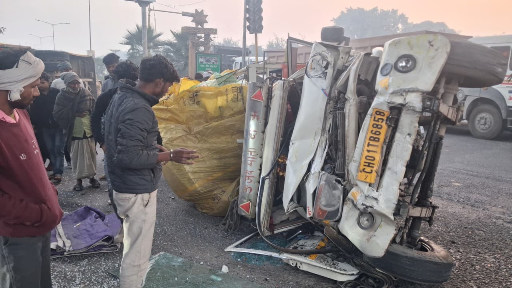Varanasi: हरहुआ रिंग रोड चौराहे पर पिकअप स्कूल बस की आमने सामने टक्कर, दोनों वाहन पलटे, बड़ा हादसा टला