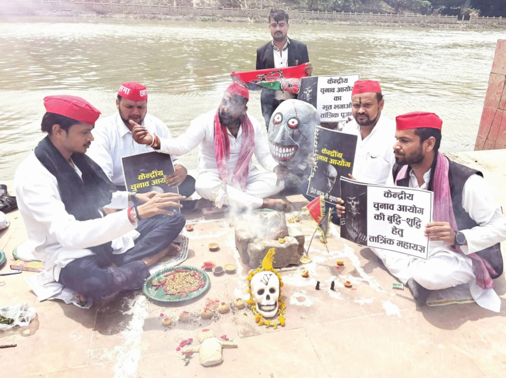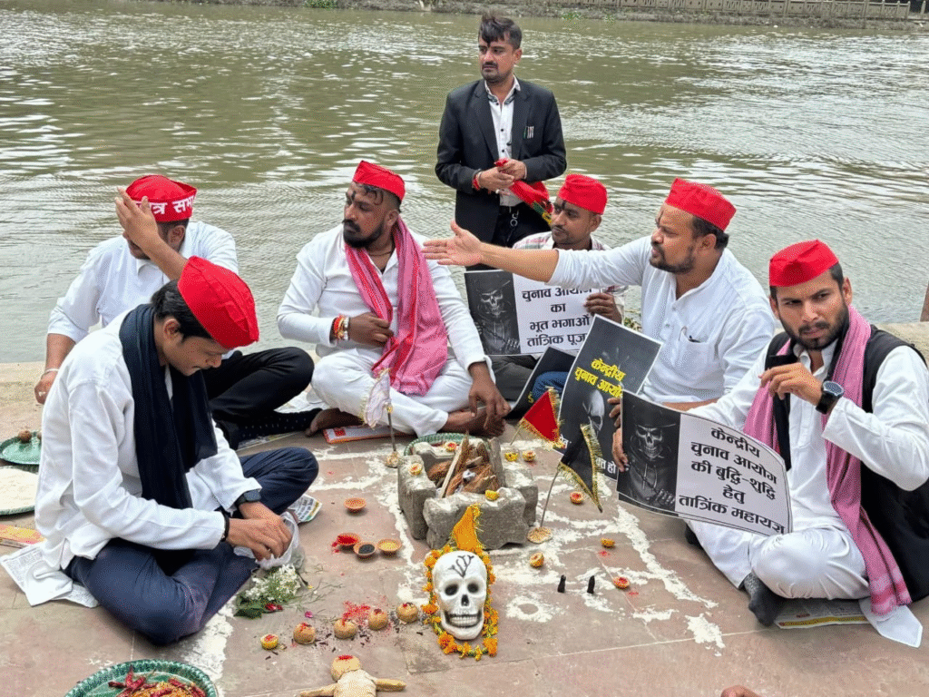 Varanasi: शास्त्रीघाट और वरुणापुल क्षेत्र में समाजवादी पार्टी के कार्यकर्ताओं ने गुरुवार को एक अनूठा विरोध प्रदर्शन किया। इस प्रदर्शन में सपाइयों ने सांकेतिक तांत्रिक पूजा का आयोजन किया। यह आयोजन चुनाव आयोग पर से कथित “भाजपा का प्रभाव और सत्ता का प्रेत” हटाने के प्रतीकात्मक प्रयास के रूप में किया गया।