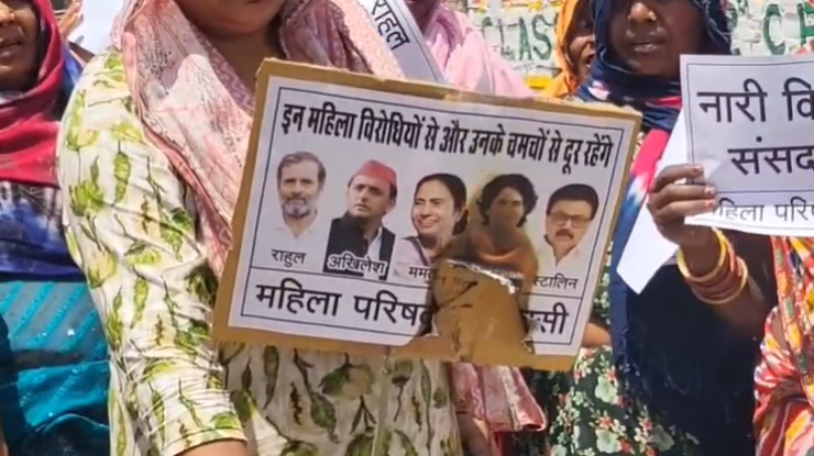 Varanasi: संसद में महिला आरक्षण बिल पास न होने के बाद इसका असर अब सड़कों पर भी दिखने लगा है। वाराणसी में महिला परिषद के बैनर तले बड़ी संख्या में महिलाओं ने कांग्रेस, सपा समेत विरोधी दलों के खिलाफ बेनकाब मार्च निकाला। इस दौरान महिलाओं ने राहुल गांधी का पुतला फूंका और विरोधी दलों पर नारी शक्ति का अपमान करने का आरोप लगाया। महिलाओं का यह मार्च सुभाष मंदिर से शुरू होकर मुंशी प्रेमचंद स्मृति द्वार, लमही (Varanasi) तक निकाला गया। प्रदर्शन में शामिल महिलाएं हाथों में पोस्टर और तख्तियां लेकर नारेबाजी करती रहीं। कई पोस्टरों पर लिखा था कि महिला आरक्षण नहीं मिलेगा तो रोटी-पानी बंद होगा।
