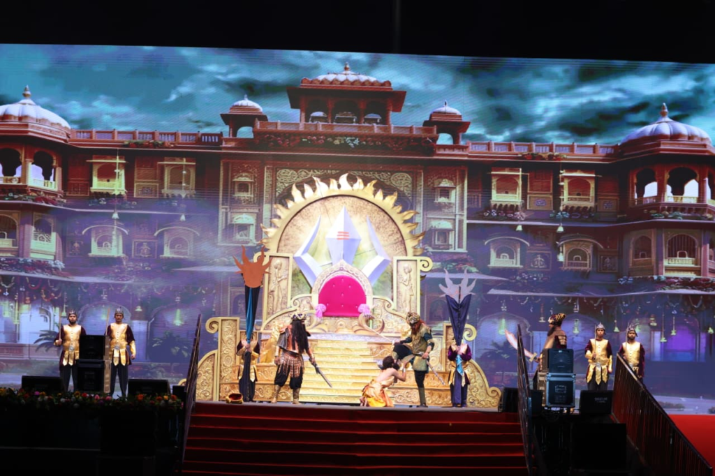 आयोजन स्थल (Kashi) पर एक साथ तीन विशाल मंच तैयार किए गए, जिन पर समांतर रूप से विभिन्न दृश्य प्रस्तुत किए गए। इन तीन मंचों के माध्यम से सम्राट विक्रमादित्य के जीवन के बाल्यकाल, वीरता और युद्ध कौशल, न्यायप्रियता, प्रजा के प्रति करुणा और समर्पण तथा विद्वानों और कला के प्रति सम्मान आदि विभिन्न पहलुओं को दर्शाया गया। इस कार्यक्रम की सबसे आकर्षक विशेषताओं में से एक था मंचन में वास्तविक हाथी और घोड़ों का उपयोग। हर मंच पर दृश्य परिवर्तन, प्रकाश व्यवस्था और ध्वनि प्रभाव इतने सटीक थे कि दर्शकों की नजरें एक पल के लिए भी मंच से नहीं हटीं।